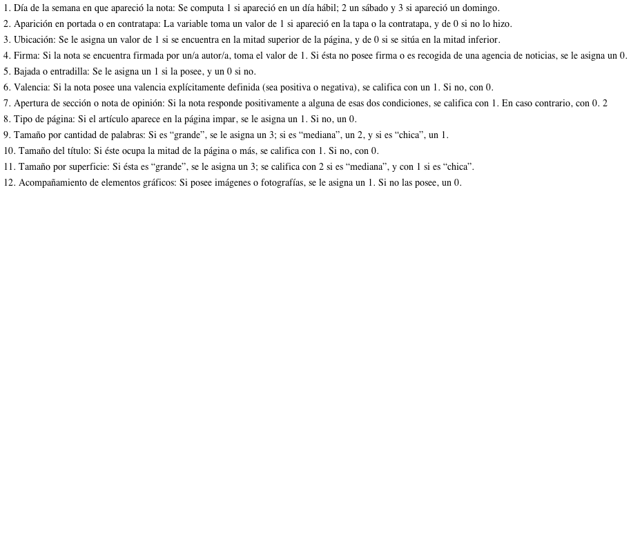 En tercer lugar, se ubicaron las piezas periodísticas referentes a la temática publicadas por ambos periódicos, obteniendo así una muestra intencional formada por 21 (veintiún) notas en total: 6 (seis) correspondientes a Página 12 y 15 (quince) en el diario Clarín. Con base en las mismas se confeccionó otra matriz de datos cuantitativos. La misma detalla si aparecen o no en la portada o la contratapa, su ubicación en la página (mitad inferior o superior), su número de página, si ésta es par o impar, si está o no firmada, si tiene bajada o entradilla, si tiene una valencia explícitamente definida o no, si abre sección o es una nota de opinión, su cantidad de palabras y su tamaño según ésta, el tamaño del título (más o menos de la mitad del ancho de la página), la superficie absoluta de la pieza en centímetros cuadrados y su tamaño según ésta, y si contiene o no imágenes. Siguiendo las dimensiones que componen el índice de importancia de Zunino (2016), una nota es más relevante para un diario si: aparece en la portada o la contratapa, está en la mitad superior de la página, se ubica en una página impar, está firmada, tiene bajada, tiene una valencia explícitamente definida, abre sección, es una nota de opinión, es más grande -en cualquiera de las tres formas del tamaño que aquí se evaluaron- y contiene imágenes. De esta manera, los datos de las primeras dos matrices nos permiten explicar cuantitativamente la relevancia.