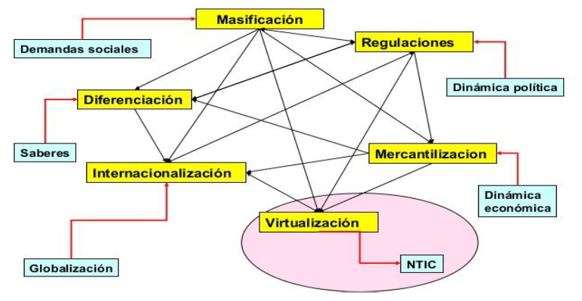 Claudio Rama (2013), en este gráfico muestra como la masificación es un tramado en busca de la internacionalización como respuesta a la globalización y a la vez constituye una tendencia o macrotendencia en la educación superior en América Latina, siendo así una dinámica constante con cambios en sus diferentes ámbitos.