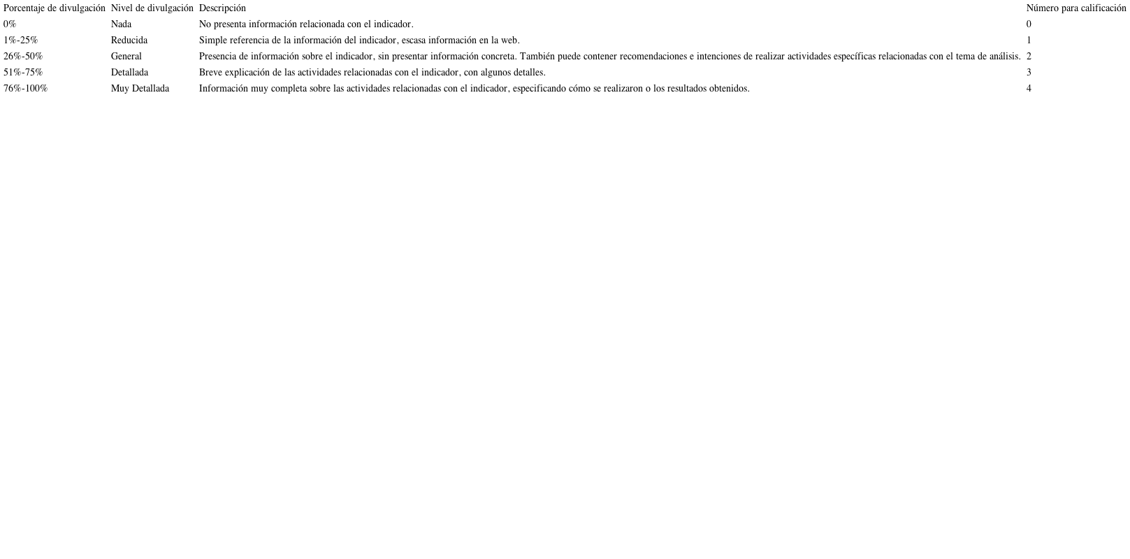 Siguiendo el trabajo de autores como Colaço y Simão (2018), Dyduch y Krasodomska (2017), y Moneva et al., (2013), se establecen cinco alternativas que permiten medir de una manera objetiva y confiable el grado de divulgación de la información de las cooperativas (Véase Tabla 1). Se utiliza una calificación que va de 0 a 100% para describir la intensidad con que una cooperativa da a conocer sus actuaciones en materia de responsabilidad social. Teniendo en cuenta el porcentaje identificado, se procede a asignar la calificación final.