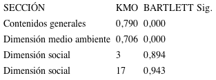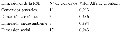 Para evaluar la consistencia interna del instrumento, se aplica la técnica del alfa de Cronbach que, según George y Mallery (2003) citado en Frías-Navarro (2014), los resultados de dicho coeficiente deben ser superiores a 0,90, ya que al tener esta carga los indicadores estaría inter-correlacionados. Es decir, cuando el coeficiente alfa es mayor a 0,90 se considera excelente (contenidos generales, dimensión social), mientras que resultados mayores a 0,80 según los autores se considera como bueno (dimensión medio ambiente), mientras que un valor de 0,60 puede ser considerado aceptable para escalas con menos de diez ítems (0,686 dimensión económica, véase Tabla 2).