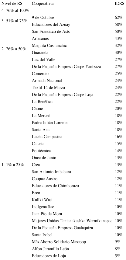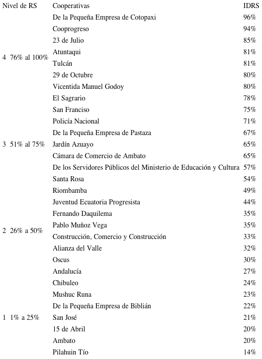 Analizada la confiabilidad y validez del instrumento, se establece el IDRS y se procede a categorizar a las cooperativas de cada segmento. De las treinta cooperativas que conforman el Segmento 1 varias se ubican dentro del nivel 4, siendo éstas las que tienen el mayor nivel de responsabilidad social (Véase Tabla 4).