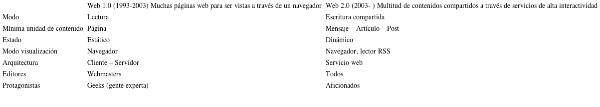 La WWW o Web 1.0, como es conocida hoy día, se conformó de un conjunto de documentos conectados entre sí a los que se puede acceder por medio de enlaces hipertextuales que se apoyan en los principios de la Internet (Rojo y Sánchez, 2009). Principios que pretenden constituir una red entre miles de ordenadores con el propósito de intercambiar información y permitir comunicaciones de personas a personas, de personas a ordenadores, y de ordenadores a ordenadores (Ibeas et al, 2000). La web 1.0, también conocida como la web del consumidor de contenidos o servicios, permitió en primera instancia la búsqueda de información, la adquisición de productos o servicios, y la comunicación a través de los correos electrónicos (García, 2010).