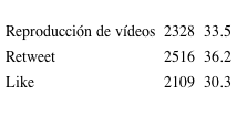 La tabla Nº6 presenta las interacciones en la plataforma Twitter desde la cuenta de usuario de la UNICA. El retweet alcanzó el primer lugar con 36.2%, la reproducción de vídeos el segundo con 33.5% y el like el último lugar con 30.3%. La diferencia en puntos porcentuales entre cada tipo de interacción no es realmente distintiva, esto probablemente se debe a que la estructura y funcionamiento de la plataforma permite a los usuarios realizar las tres interacciones casi de forma simultánea. No obstante, es importante destacar que el número total de interacciones no es cónsono en relación con el número de usuarios seguidores que está ubicado alrededor de 18 mil, la cantidad de interacciones es realmente baja.
