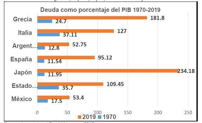 Asociado a la inflación se halla el déficit público. Este puede ser causado por factores como la baja recaudación, la pérdida de dinamismo e conómico y el costo creciente del servicio de la deuda. Con déficit, los agentes económicos tienen un entorno complicado y el margen de maniobra del gobierno se reduce. Existen presiones para mantener y aun expandir el nivel de gasto: el tamaño del gobierno, el gasto militar, el Estado de bienestar, además de inversiones en infraestructura indispensables para atraer la inversión y el desarrollo social. La Gráfica 2 muestra el crecimiento de la deuda pública como porcentaje del Producto Interno Bruto (PIB) entre Grecia, Italia, Argentina, España, Japón, Estados Unidos y México. En todos ellos, en casi medio siglo creció varias veces su tamaño: en Grecia poco más de siete veces, en Italia y Argentina poco más de cuatro veces, en Estados Unidos y en México poco más de tres veces.