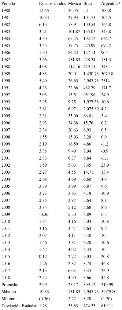 Respecto a las diversas experiencias de inflación en países como Estados Unidos, México, Brasil y Argentina, deben señalarse los efectos diversos en estos, pues en algunos periodos ha sido severa y extensa, además de dificultarse su cuantificación con precisión. En otros, las tasas han sido relativamente moderadas. En la Tabla 1 se observa como en el periodo 1980 a 2018, los precios fueron en general elevados en México, Brasil y Argentina, consideradas economías importantes en América Latina. Aunque los datos no se muestran aquí, entre 1973-1974 y luego entre 1979 y 1980, se produjo la primera y segunda crisis petrolera a nivel internacional. Los precios del crudo se incrementaron considerablemente. Estados Unidos experimentó niveles elevados en este indicador entre 1980 y 1981, pero después se observa una reducción a lo largo del periodo.