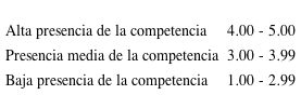 Para desarrollar el estudio, fue seleccionada como técnica la observación mediante encuesta, definida por Arias (2012), como aquella que pretende obtener información suministrada por un grupo o muestra de sujetos acerca de un tema particular. Según Tamayo y Tamayo (2014), es una forma concreta de la técnica de la observación, constituida por preguntas, formuladas por escrito, que generalmente no requieren la presencia del investigador para su aplicación. Por ello se diseñó un instrumento escalar de 15 ítems, repartidos de modo equitativo entre cada tipo de competencia considerada, con alternativas de respuesta Siempre, Casi Siempre, Casi Nunca y Nunca, validado por cinco expertos y una confiabilidad basada en la estimación del coeficiente Alfa de Cronbach, cuyo resultado fue de 0,86, utilizándose para el análisis de los resultados el siguiente baremo.