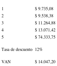 El objetivo del valor actual neto (VAN), es identificar la rentabilidad de la inversión realizada frente a una de menor riesgo. Para su cálculo se requiere de insumos como la proyección de ingresos y gastos. En este trabajo se obtuvo como resultado un VAN positivo de $14.047,20, reflejado en la tabla No. 5.