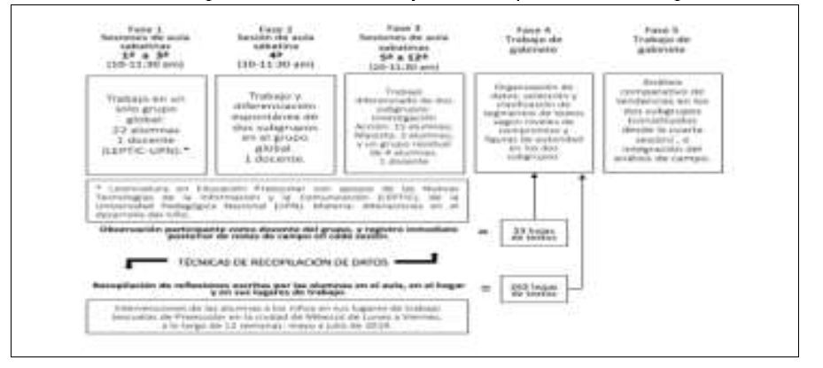 El grupo de indagación se reunió una vez a la semana; a saber, cada sábado, en doce sesiones de una hora y media cada una. Sus intervenciones a los niños se realizaron en las mismas escuelas de preescolar donde ellas laboran, de lunes a viernes de 9 AM a 2 PM, mismas que fueron reportadas en reflexiones escritas que ellas realizaron tanto en sus hogares, como en las sesiones sabatinas de aula en la Universidad Pedagógica Nacional. En éstas últimas, las alumnas educadoras también participaron a través de reflexiones y discusiones que externaron de manera oral en cada una de las sesiones de aula.