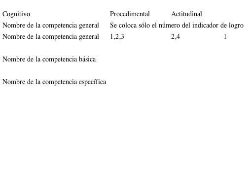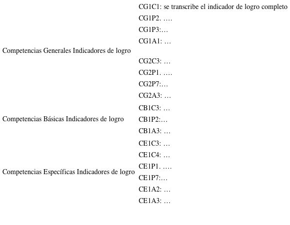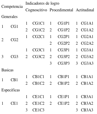 Se sugiere a los gestores curriculares, construir una matriz donde se lleve el consolidado de las competencias abordadas en el plan de estudio (Tabla 8), la misma con la ayuda de la codificación elaborada debe reflejar los indicadores de logro abordados por cada unidad curricular, lo cual permite verificar si se contemplan la totalidad del perfil académicoprocedimental desde las unidades curriculares. Esto no debe confundirse con un proceso de certificación de competencias por cuanto el mismo sólo puede ser evaluado en los futuros profesionales.