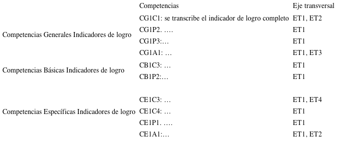 A diferencia de la selección para cada eje transversal, las unidades curriculares deben partir de los indicadores de logro ya seleccionados previamente por el eje o ejes que asume. Un modelo de matriz para el listado de competencias generales, básicas y específicas abordadas por la unidad curricular se explicita en la Tabla 3, la misma cuenta con una columna adicional donde se indica el eje transversal que refleja el indicador que deriva del perfil académico profesional.