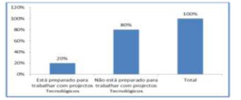 Os gráficos acima representam a percentagem de professores que possuem alguma preparação e habilidade para a utilização de recursos tecnológicos. Num total de 300 professores distribuídos pelas 50 escolas visitadas, maior parte (80%) dos envolvidos em projectos não possuem um nível de preparação que os permita desenvolver aulas com qualidade; 20% possuem alguma preparação para o desenvolvimento das aulas com alguma qualidade. Do ponto de vista das habilidades básicas para o uso destes recursos tecnológicos (70%) não possuem habilidades básicas para o uso destes recursos tecnológicos e (30%) possuem habilidades básicas para o uso destes recursos tecnológicos, o que tem dificultado o cumprimento dos objectivos;
