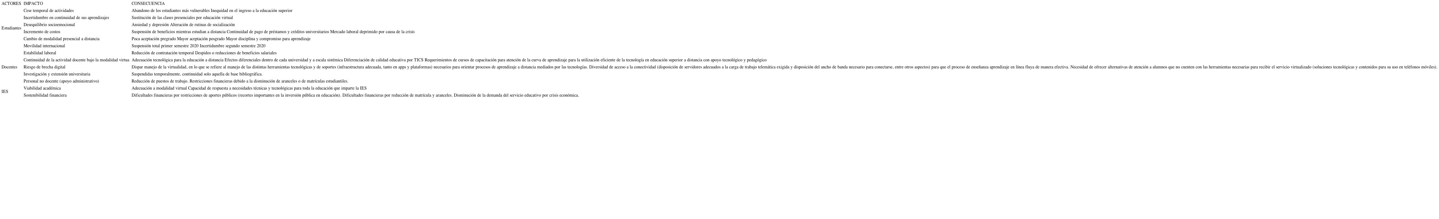 En el caso de la educación universitaria, los condicionantes expuestos tienen afectación directa sobre los actores del sistema de educación superior. Estudiantes, docentes e Instituciones de Educación Superior (IES), son receptores d el impacto que la coyuntura actual tendrá en la prosecución académica, la docencia y la sostenibilidad de la IES. Seg uidamente en la Tabla No. 1, se presentan los efectos discriminados para cada segmento del proceso educativo.