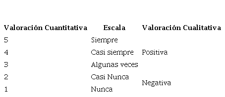 Para simplificar los resultados se creó una rúbrica que agrupa alternativas con valoración cuali-cuantitativa-positiva: 5, 4 y 3, respectivamente, mientras que se hace referencia a que no hay afinidad cuando las respuestas predominantes correspondan a las respuestas con ponderación cuali-cuantitativa negativa: 2 y 1, respectivamente, como se puede observar en el cuadro 1.