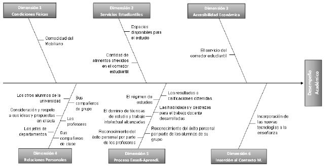Finalmente se empleó el índice de correlación de Spearman para determinar las relaciones entre el desempeño académico total con cada uno de los 94 indicadores que medían la satisfacción. Con estos resultados se construyó un diagrama de Ishikawa en el que se podían observar las correlaciones existentes y para poder analizar finalmente los hallazgos obtenidos.