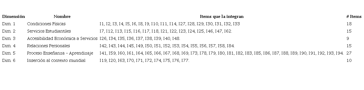 En cuanto a la segunda dimensión, se puede notar que existen dos correlaciones altamente significativas, pertenecientes a los Items 07 y 23, los cuales corresponden a los espacios disponibles para el estudio y la cantidad de alimentos ofrecidos en el comedor estudiantil respectivamente. El primero se refiere a la existencia de lugares en los cuales los alumnos puedan estudiar o practicar, y el segundo trata de la importancia que tiene para los alumnos la disponibilidad de un comedor que los ayude a poder alimentarse adecuadamente al menos una vez al día, y en el caso de los estudiantes foráneos, dos veces al día.
