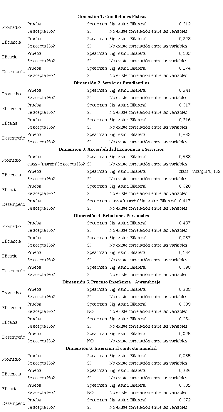 Como se puede observar, fueron muy pocas las correlaciones significativas halladas entre las seis dimensiones medidas con el desempeño académico, y con los 3 factores que lo integran (promedio, eficiencia y eficacia), por lo que se puede decir que el modelo no se ajusta adecuadamente a la hipótesis planteada, ya que solo se ajusta en el caso de la Eficiencia con las dimensiones 5 y 6. Por su parte, se hace importante resaltar que la Dimensión 5 es la única que muestra un nivel de correlación estadísticamente significativo con el desempeño, lo cual es importante, ya que ésta dimensión se refiere al Proceso de Enseñanza – Aprendizaje, y era esperable que mostrara algún tipo de reciprocidad.