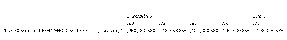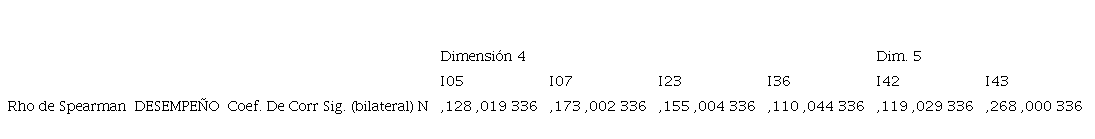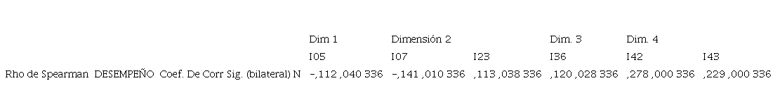Como las dimensiones no mostraron tener mucha relación, se procedió a realizar unas pruebas de hipótesis con cada uno de los ítems que conforman las dimensiones con respecto al desempeño académico total. Como la muestra no presenta una distribución Normal, de acuerdo a los resultados obtenidos al aplicar las pruebas de Kolmogorov Smirnov, se realizaron los análisis a través del cálculo del Rho de Spearman, y los resultados significativos de las correlaciones para cada una de las dimensiones se muestran en la Tabla 4 presentada a continuación.