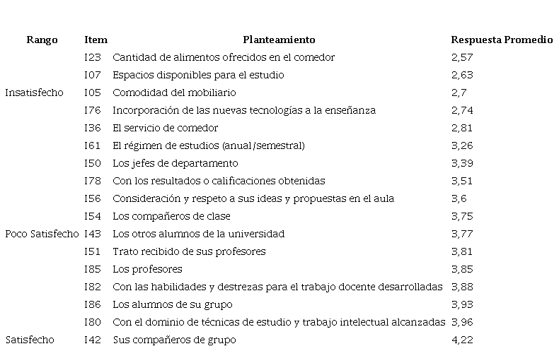 Se determinó también que la opinión promedio de los estudiantes con respecto a los indicadores que se correlacionaban con el desempeño académico oscilaba entre 2 y 4 puntos, notándose que los ítems con menor valoración se encontraban relacionados con el Comedor Estudiantil y los de mayor nivel de satisfacción con sus compañeros de grupo, su autorrealización y la calidad de la enseñanza recibida por parte de sus profesores, notándose entonces que su sentido de pertenencia al grupo y sus buenas relaciones con sus pares y superiores son aspectos motivadores de los estudiantes. Por otro lado, se debe prestar especial atención en aquellos peores valorados para tratar de desarrollar las mejoras pertinentes en aras de incrementar el desempeño de los estudiantes.