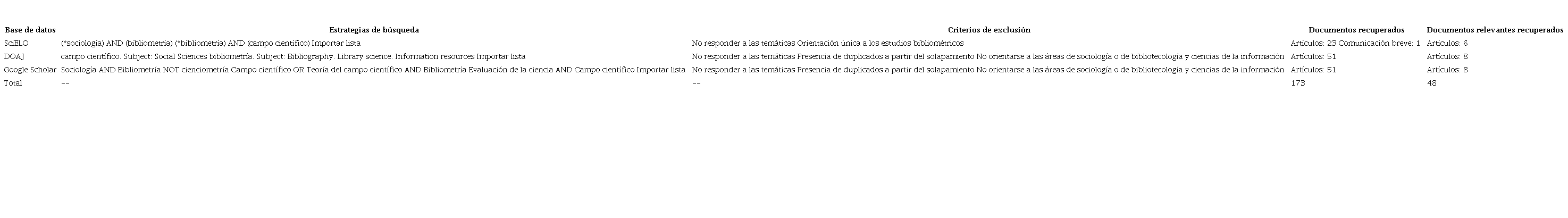 Se consultaron 173 documentos que fueron discriminados a partir de criterios de exclusión propuestos para los propósitos del presente estudio. Se definieron categorías que permitieron la extracción de información relevante. En primer lugar, se localizaron los referentes en torno a los campos científicos desde tres disciplinas sociológicas: 1) sociología del conocimiento, 2) sociología de la ciencia y 3) sociología del conocimiento científico. La estrategia de búsqueda y los criterios de exclusión por base de datos se muestra en la Tabla 1.