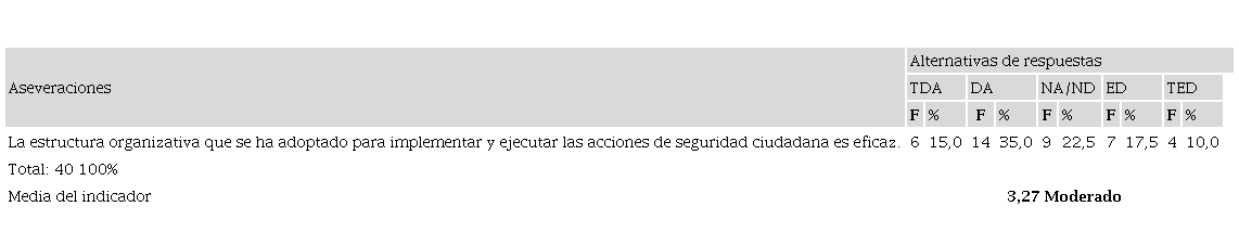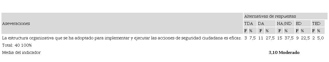 Con respecto al recurso organización, presentado en la tabla 6 con una media moderada de 3,10, se observan diversidad en las respuestas. Por un lado, un grupo importante de informantes (37,5%) prefirieron mantener una posición neutral con respecto a la eficacia de la estructura organizativa adoptada para implementar y ejecutar las acciones de seguridad ciudadana en el cantón Portoviejo; opinión tal vez motivada por desconocimiento sobre este aspecto, lo cual está conectado con la debilidad presentada en el recurso información.