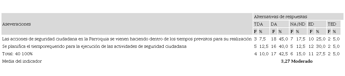 Por su parte, en la tabla 8 se observa el recurso tiempo. La mayoría de los encuestados respondieron positivamente en cuanto a que las acciones de seguridad ciudadana en el Cantón Portoviejo, se vienen haciendo dentro de los tiempos previstos para su realización (de acuerdo 45%); y que se planifica el tiempo requerido para la ejecución de las actividades de seguridad ciudadana (40% de acuerdo). Contrapuestos a estos resultados, un 27,5% manifestó estar en desacuerdo con tales aseveraciones. Aunque no hay consenso en las respuestas, la tendencia es positiva en relación a la administración del tiempo como recurso fundamental para la gestión pública.