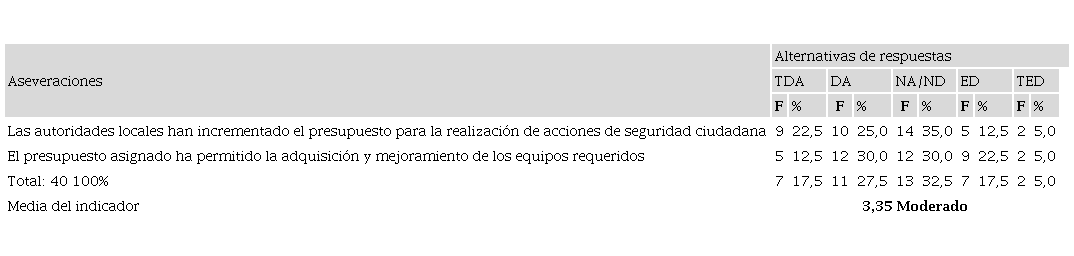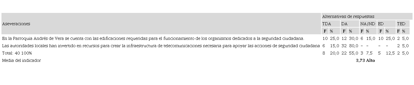 En cuanto al recurso infraestructura, Knoepfel et al., (2007, p.22) indican que toda política pública reviste la asignación de bienes públicos. “Las menos provistas gozan exclusivamente de los inmuebles que albergan los servicios encargados de su elaboración o de su ejecución; otras cuentan con amplios espacios”. En ese sentido, se puede ver en la tabla 9, que el 55% y el 20%, están de acuerdo en señalar que en el cantón Portoviejo, se cuenta con las edificaciones requeridas para el funcionamiento de los organismos dedicados a la seguridad ciudadana; y que las autoridades locales han invertido en recursos para crear la infraestructura de telecomunicaciones necesaria para apoyar las acciones de seguridad ciudadana. Mientras que un 17,5% 8 (suma de los valores con orientación negativa) manifestó un comportamiento negativo ante las aseveraciones.