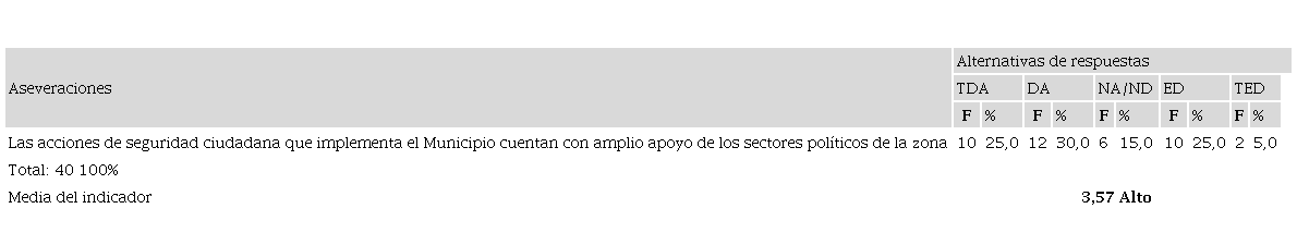 Al respecto, en la tabla 7, un porcentaje alto de los encuestados están de acuerdo (35%) en que para la realización de las acciones de seguridad ciudadana, se ha requerido el consenso de los sectores económicos y sociales de la zona. Respuestas que se explican debido a que las acciones que se emprendan para mejorar los niveles de convivencia en el espacio local, deben estar acompañadas por la voluntad de todos los sectores económicos, sociales, políticos y comunitarios, para así activar los mecanismos necesarios para desmontar los escenarios de incidencia social como la delincuencia, la deserción escolar, el consumo de sustancias no permitidas, maltrato a niños, jóvenes, mujeres y adultos mayores, entre otros aspectos.