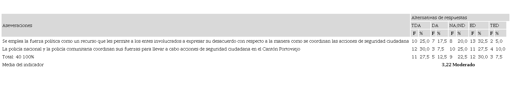 Con la misma orientación positiva en la respuesta el 37,5% (sumatoria de las dos alternativas) de los encuestados, piensan que la policía nacional y la policía comunitaria coordinan sus fuerzas para llevar a cabo acciones de seguridad ciudadana en el cantón Portoviejo. En tanto, el otro 37,5% (adición de las alternativas negativas) manifestó su desacuerdo ante tales aseveraciones. Se debe notar, además como un 22,5% señaló estar ni de acuerdo, ni en desacuerdo con las afirmaciones propuestas. Destaca la posición contraria del 37,5% de los consultados, lo que podría estar relacionado con el uso abusivo de la fuerza por parte de los organismos del estado. Un tema que ha cobrado fuerza en los últimos años, llevando al gobierno ecuatoriano a plantear la regulación progresiva del uso de la fuerza en todas las instituciones de seguridad (El Universo, 2021). En ese sentido, señala Bernal (2019, p.263) que “respecto a la policía y el uso de la fuerza pública, cabe decir que los derechos humanos constituyen, o deberían constituir, el principal límite del uso de la fuerza pública”, indistintamente de las características del entorno social y las causas que induzcan al uso de la fuerza, pues la prioridad siempre debe ser la protección de los derechos humanos.