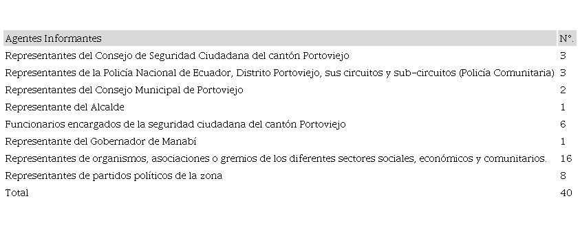La población la conformaron todos los organismos públicos involucrados con la seguridad ciudadana del cantón Portoviejo, a saber: Consejo de Seguridad Ciudadana del cantón Portoviejo; Policía Nacional de Ecuador, Distrito Portoviejo; Policía Comunitaria de Portoviejo; Consejo Municipal de Portoviejo; Alcaldía del Cantón de Portoviejo; Gobernación de Manabí; partidos políticos de la zona y organismos, asociaciones o gremios de los diferentes sectores sociales, económicos y comunitarios.