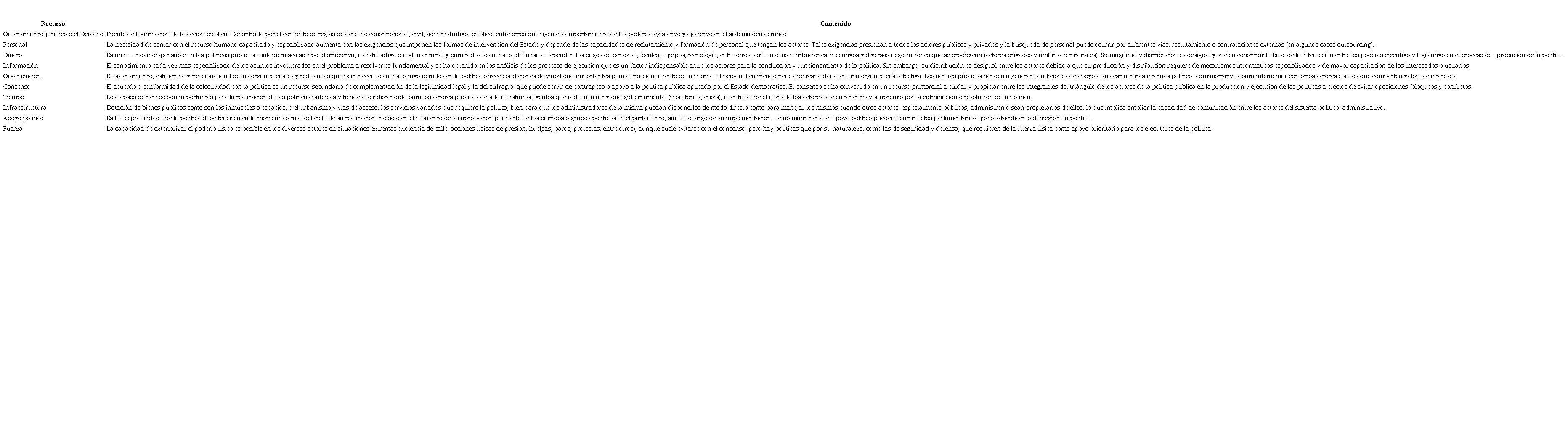 Por su parte, Knoepfel et al., (2007), son más específicos en el abordaje de los recursos y consideran que los mismos se encuentran repartidos de manera desigual entre los actores participantes en las diversas etapas del ciclo de una política pública, a pesar que en su mayoría son accesibles a todos. Ahora bien, los autores indican que toda acción pública “no se establece ni se ejecuta en un espacio vacío, ya que los recursos disponibles influyen, desde un principio y de forma definitiva, en sus resultados intermedios y finales”, (Knoepfel et al, 2007, p. 17) y presentan diez recursos que los actores podrán o no producir y activar en la formulación y ejecución de la política, los cuales se muestran en el cuadro 4.