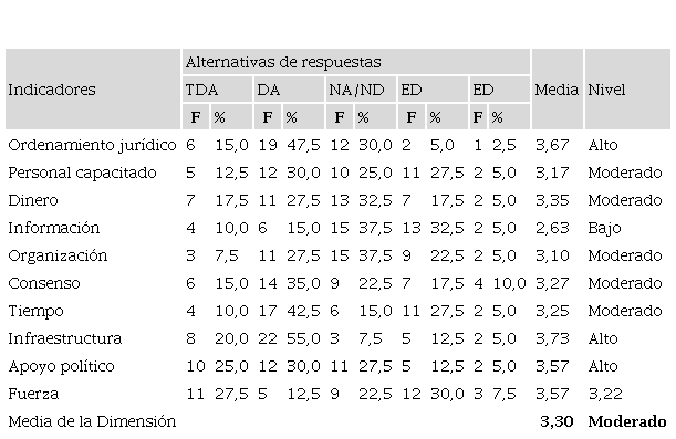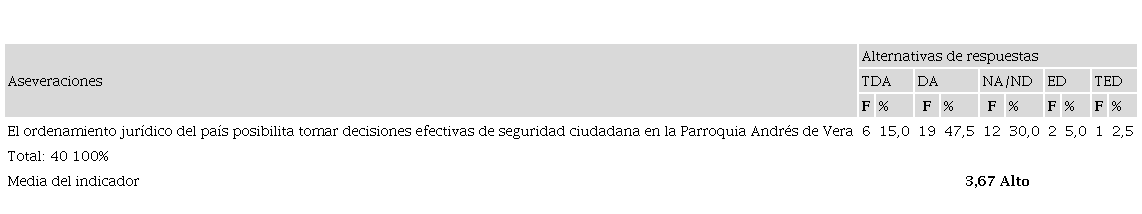 En cuanto al recurso ordenamiento jurídico (Tabla 2), con una media de 3,67 que lo ubica en un nivel alto, los encuestados están de acuerdo (47,5%) que éste posibilita tomar decisiones efectivas de seguridad ciudadana en Portoviejo, lo cual muestra la existencia de un marco jurídico que respalda la ejecución de esta política pública. En ese sentido, precisan Chinchilla y Vorndran (2018), que en América Latina, en los noventa, destaca el avance significativo del tema de la seguridad, con la promulgación de un frondoso marco legislativo que dio sustento jurídico a transformaciones institucionales. En el caso de Ecuador, se promulgó la Ley de Seguridad Pública y del Estado en 2009, y en los últimos años, es un proceso que continúa en evolución.
