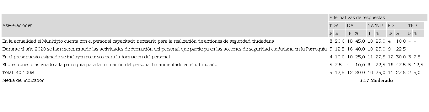 Vale la pena resaltar que, los sujetos están de acuerdo (45%) en señalar que en la actualidad el cantón Portoviejo cuenta con el personal capacitado necesario para la realización de acciones de seguridad ciudadana, y que durante el año 2020, se incrementaron las actividades de formación del personal que participa en las acciones de seguridad ciudadana (40% de acuerdo). Ello podría ser indicativo del esfuerzo de las autoridades para dotar al personal del conocimiento y herramientas necesarias para mejorar la seguridad del ciudadano en su espacio de convivencia.