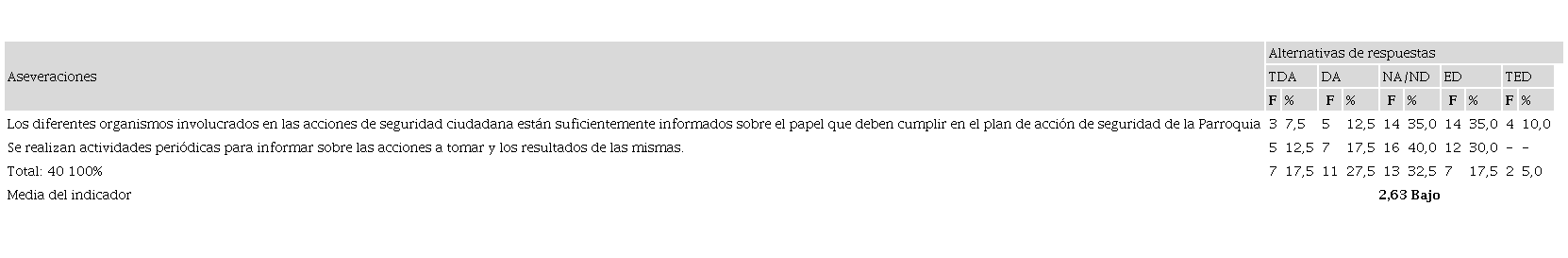 Para los encuestados, se presentan problemas con respecto a la información manejada por los entes responsables de la seguridad ciudadana en el Cantón Portoviejo. Así, tienen opiniones negativas, o simplemente se mantuvieron neutrales al señalar que efectivamente, los diferentes organismos involucrados en las acciones de seguridad ciudadana no están suficientemente informados sobre el papel que deben cumplir en el plan de acción de seguridad de la parroquia (45%), sumatoria de las dos categorías negativas), y que no se realizan actividades periódicas para informar sobre las acciones a tomar y los resultados de las mismas (30%). Lo que sin duda limita la toma de decisiones de carácter estratégico ya que esta última está relacionada directamente con el uso adecuado de información (Rodríguez-Cruz y Pinto, 2018).