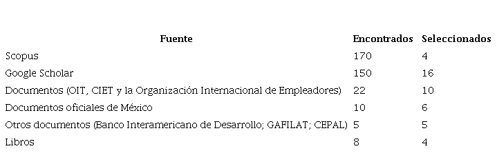 La Tabla 1 muestra el resumen de la revisión bibliográfica, en donde de los 20 artículos científicos, dos se refieren a los aspectos metodológicos, los 18 restantes fueron seleccionados a través de las bases de datos relacionados con el tema de investigación, 10 documentos analizados corresponden a organizaciones internacionales tales como Conferencia Internacional de Estadísticos del Trabajo (CIET); Organización internacional del trabajo (OIT); y la Organización Internacional de Empleadores que estudian directamente a la economía informal, sector informal y al empleo informal. Por otro lado, fueron seis documentos oficiales de México, correspondientes a la Gaceta Económica, al Banco de México y al INEGI. Los otros cinco documentos corresponden al Banco interamericano de Desarrollo escrito por (Acevedo et al., 2021), GAFILAT, CEPAL incluyendo un trabajo de tesis, finalmente fueron seleccionados cuatro libros para su revisión y análisis.