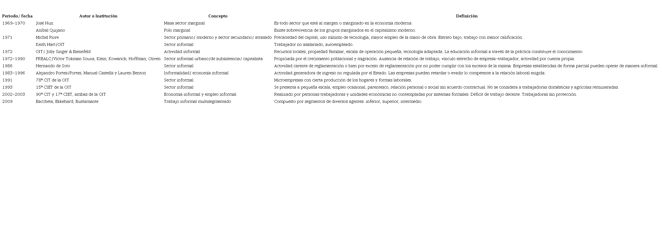 En ese tenor, con base a Conde González y Marie Delaplace (2016) se exponen de forma histórica la evolución conceptual de economía informal con base a diversos periodos, caracterizando los elementos sustanciales de cada uno, ver la tabla 2.