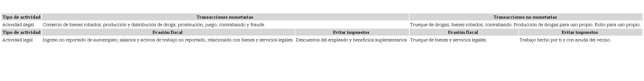 En la construcción y exposición de la evolución y dinámica del concepto se enuncian el conjunto de actividades que integran la economía informal que constituye grado de afectación en la organización de las transacciones económicas de toda nación. Asimismo, es concerniente a temas legales e ilegales, a las actividades productivas basadas y no basadas en el mercado y su interacción (Chapa Cantú et al., 2008), como se presenta en la tabla 2.