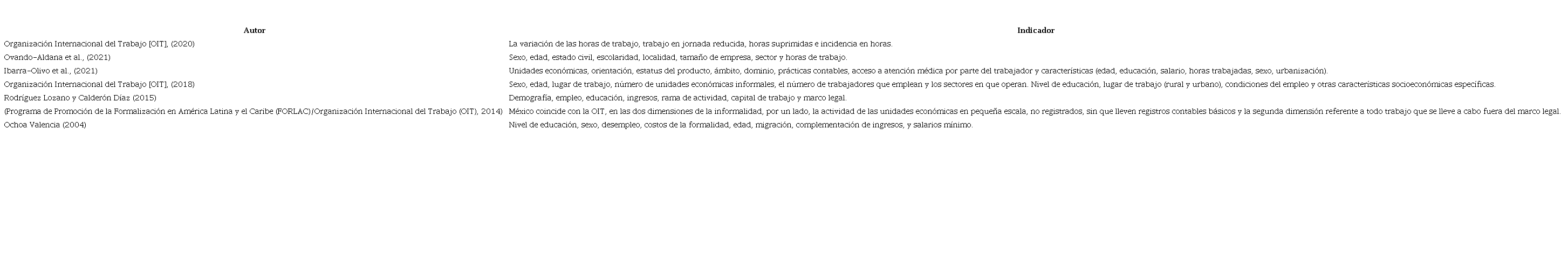 De acuerdo al análisis de la conceptualización de la economía informal que se detalla en el documento, por diferentes autores se encontraron los siguientes elem1entos: la inexistencia de contratos entre el empresario y el trabajador que representen acuerdos, lo que conlleva a una carencia de protección jurídica del trabajador; los negocios son propiedad familiar (CIET, 1993; Pérez Calderón, 2004); sus actividades económicas son a pequeña escala (CIET, 1993; Lafuente Ibáñez et. al. (2018); la economía informal afecta el cálculo del PIB, puesto que, contiene los datos formales de la economía y no son contempladas en este cálculo los datos de la economía informal (Banco de México, 2021; Chavarría Puga y Chavarría Santibáñez, s/f; Fernández García, 2012; GAFILAT, 2020; Lafuente Ibáñez et. al. 2018; Levy y Székely, 2016; Pérez Calderón, 2004; Portes y Haller 2004) observan que en los periodos en que el PIB real aumenta, disminuye el empleo informal y viceversa, al aumentar el PIB real tiende a disminuir la tasa de ocupación en el sector informal; y sus actividades las realizan fuera del marco legal, afectando la riqueza nacional al no percibir ingresos públicos como parte de los impuestos correspondientes (Ibarra-Olivo et al., 2021;Jiménez Martínez 2012; OIT, 2018; OIT, 2003).