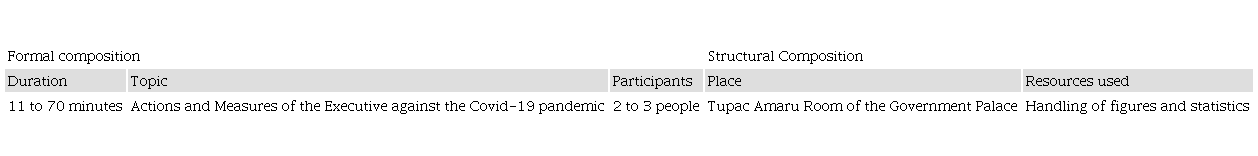 Regarding the structural composition, 94% of the press conferences were held in the Tupac Amaru Room of the Government Palace, the handling of statistical figures was used in 94% in the press conferences and the use of multimedia equipment and slides by 12%.