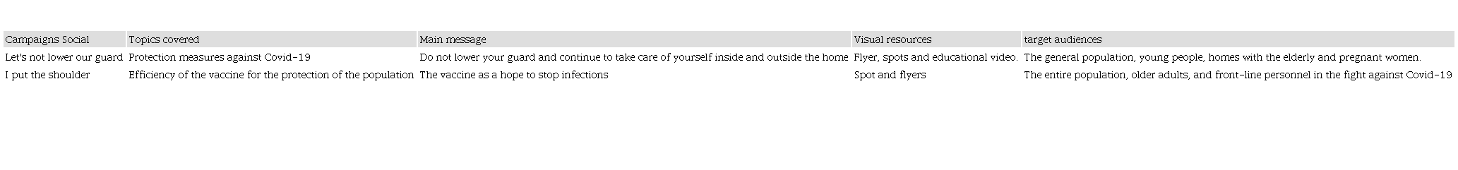 During the second wave of Covid-19, the Government implemented different social campaigns to inform and raise awareness in the population about biosecurity care to avoid infections and deaths. This is how the communication campaigns "Let's not lower the guard" and "Put my shoulder" arose, with a health communication strategy, responding to the increase in infections, health measures to reinforce them and involving citizens so that they take into account that they are responsible of the Covid-19 transmission chain, seeking to change people's behavior.