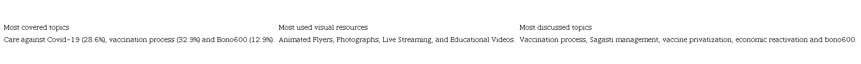 During the study of the Facebook of the Presidency of Peru, it was evidenced the dissemination of information was divided between the vaccination process (32.9%), care against Covid-19 (28.6%), the Voucher 600 (12.9%), and other activities of the president. While in the study by Soto and Fernández (2020), on Nayib Bukele's communicational strategy on Twitter during the Covid-19 pandemic in El Salvador, it revealed that his publications were divided into the evolution of infections, deaths, and recovered patients from Covid-19; the construction of health centers for the treatment of the pandemic and finally the economic and social containment measures. The president of El Salvador segments the content of his Twitter page to cover information about the health emergency in his country. In Peru, the presidency also followed the strategy of meeting this need, but focuses, to a large extent, on communicating about the vaccination process, since it became the main means of protection to avoid serious risks caused by Covid-19. Digital media have been the most used support to cover the information needs that the population has about Covid-19, and it has been of great help for government entities, since they could analyze the situations that citizens live day by day because of the deadly virus (Lázaro and Herrera, 2020).