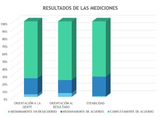 Por otro lado, en la figura 2 se muestran las dimensiones: orientación a la gente y orientación al resultado, más cercanas en sus valores resultantes a la dimensión estabilidad. Se detallan claramente que los valores para la respuesta medianamente en desacuerdo, de los ítems en la escala de Likert, marcan la diferencia ya que son despreciables para Estabilidad; igualmente los valores de medianamente de acuerdo sumado a los valores completamente de acuerdo también son superiores en la dimensión Estabilidad.