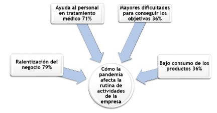 La pandemia, también como factor externo que afecta la rutina de actividades de la empresa, produjo como mayor efecto la ralentización del negocio productivo. La movilización restringida provocó también dificultades para cumplir con los objetivos de productividad de las empresas; el bajo consumo de los productos, por otro lado fue un indicador también mencionado, entre otros.