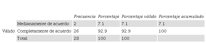 Los resultados o respuestas, de los dos cuestionaros para la evaluación cuantitativa, se procesaron mediante el software estadístico para Windows SPSS25®. El posterior análisis y explicación de los resultados mediante el diseño de triangulación concurrente permite el aporte científico, la generación de las conclusiones y las recomendaciones. Utilizando la estadística descriptiva con las salidas de frecuencias de las variables o ítems, resalta la cultura organizacional con inclinación a la Estabilidad. Algunas de las tablas se presentan a continuación especificando el indicador correspondiente, en la dimensión Estabilidad; considerando un total de 28 encuestas (14 obreros y encargados y 14 administradores y gerentes), se obtienen los siguientes resultados: