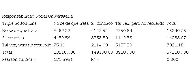 De los 373 encuestados, 84 estudiantes indicaron que “no saben de que trata” el contexto de Triple Botton Line y Responsabilidad Social Universitaria, Medina et al. (2017) expone que la educación superior, tiene la necesidad de incluir este compromiso social; aunque su aplicación es reciente en los últimos tiempos se inició el proceso de estrategias que acepta enfoques nuevos a partir de lo académico, investigación y proyección hacia áreas de la sociedad en general. Por otro lado, el número de 87 estudiantes indican que “si conocen” sobre estas gestiones; mientras 51 estudiantes respondieron que “tal vez, pero no recuerdan”. Se puede observar en la tabla de contingencia existe un mayor número de conocimiento sobre los dos temas, cabe recalcar que el TBL posibilita integrar aspectos esenciales que fomenten la innovación (Ivorra Peñafort, 2017). El estadísitco de Chi-cuadrado de Pearson para la prueba resulta ser de 131.3951, el p-valor tiene un valor menor al 0,05 lo cual indica que se rechaza la hipótesis alternativa y acepta la hipótesis nula que expresa que las dos variables son dependientes.