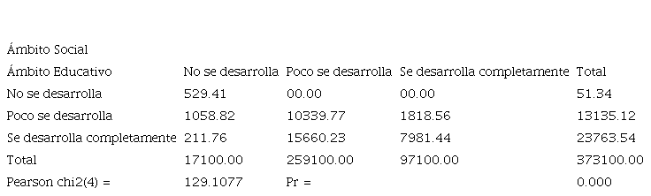 En la siguiente tabla, corresponde al proceso en la cual se desarrolla más la RSU, donde se obtuvieron respuestade 156 estudiantes, indicando que la mayoría selecciona “poco se desarrolla” en el ámbito social, que abarca la interacción con la sociedad conjuntamente con distintos agentes de la comunidad (Hernández Ascanio et al., 2016). De igual forma, en el ámbito educativo Tocora Lozano y García González (2018) mencionan que la educación forma parte de un desarrollo de socialización. El resultado de 129.1077 indica el valor del Chi-cuadrado de Pearson, en la cual el p-valor tiene un valor de 0.00 siendo menor al 5%, por lo tanto, se rechaza la hipótesis alternativa y acepta la hipótesis nula.