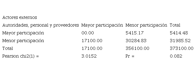 Con respecto, a la siguiente tabla se puede identificar que 302 estudiantes señalan la baja intervención de estos participantes del grupo de interés, los cuales son autoridades, personal y proveedores; y actores externos (sector público, privado y civil). Se identifica que el p-valor es 0.082, evidenciando que no existe una buena relación ya que supera el 0,05 por lo cual no existe una asociación significativa entre las variables (Vilalta Perdomo, 2016).