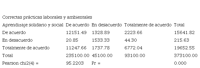 Se puede evidenciar que 121 estudiantes están de acuerdo que la RSU impacta en el aprendizaje solidario y social; conjuntamente con las correctas prácticas laborales y ambientales. Por otro lado, 67 estudiantes indican que están totalmente de acuerdo con el impacto de la RSU en las actividades que ejecuta la comunidad universitaria. En esta el estadísitco de Chi-cuadrado de Pearson resulta ser de 95.2203, el p-valor tiene un valor menor al 5%, se rechaza la hipótesis alternativa y acepta la hipótesis nula, lo cual expresa que hay impacto de la RSU por parte de las correctas prácticas laborales y ambientales, y el aprendizaje solidario y social.