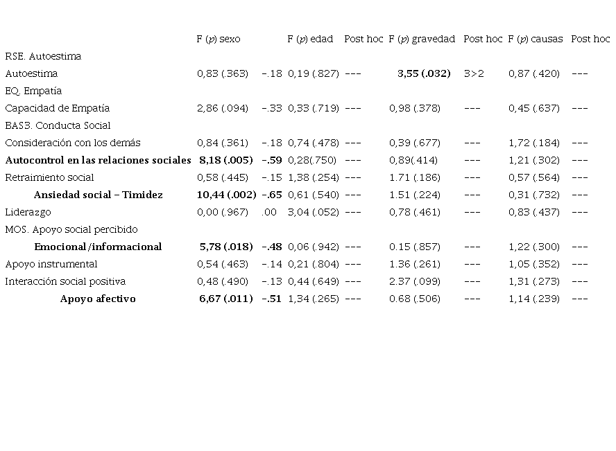En tal sentido, se declara que no se han hallado prevalencias entre el factor sexo en autoestima, resiliencia, afrontamiento del estrés, y síntomas psicopatológicos. Sin embargo, se ha encontrado que las mujeres tienen más conductas de autocontrol en las relaciones sociales, más conductas de ansiedad social, menos victimización y perpetración de acoso presencial (conductas agresivas físicas, verbales, sociales y psicológicas). En cuanto al factor edad se reportan diferencias estadísticas significativas en las variables perseverancia y victimización por acoso escolar en todos los participantes. Los datos evidencian un aumento significativo de la perseverancia a medida que aumenta la edad de los adolescentes, mientras que las conductas de victimización por acoso escolar disminuyen significativamente. Respecto al factor gravedad de la discapacidad se reporta diferencia estadística significativa en autoestima, somatización y ansiedad. Así, aquellos estudiantes adolescentes que tenían discapacidad grave mostraron significativamente mayor autoestima. Mientras que aquellos con discapacidad leve mostraban significativamente mayores puntuaciones en síntomas de somatización y ansiedad con relación a los que tenían moderada o grave; y se confirma ausencia de diferencias estadísticamente significativas en todas las variables estudiadas en función a las causas de la discapacidad.