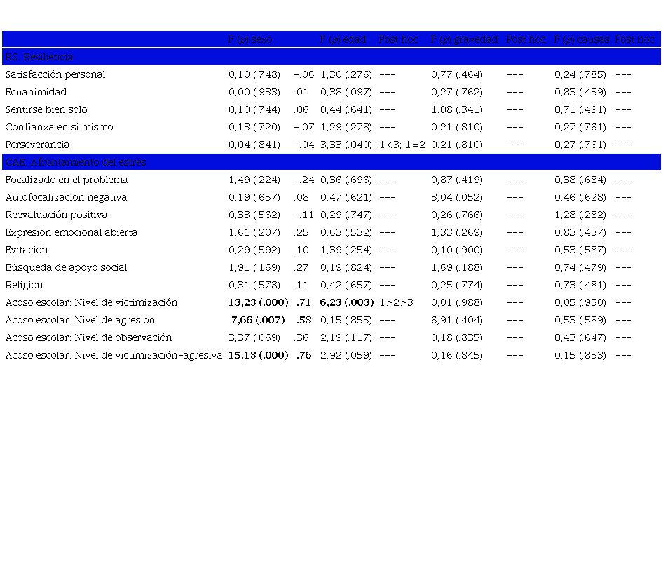 En los resultados obtenidos no se han hallado diferencias en consideración en resiliencia y en afrontamiento del estrés para el factor sexo. Existen diferencias significativas para el factor edad (grupo 11 a 18 años), en perseverancia y victimización por acoso escolar.