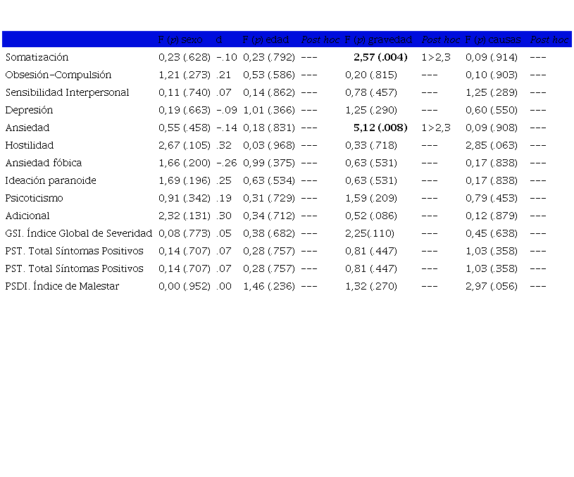 En respuesta a la pregunta 3: ¿Existen diferencias estadísticas significativas entre los síntomas psicopatológicos de los adolescentes con discapacidad motora en relación a los factores sexo, edad, gravedad y causas de la discapacidad? A continuación, se presentan las mediciones de los síntomas psicopatológicos de los participantes con discapacidad motora a nivel de la varianza y tamaño del efecto (d de Cohen) en los factores sexo, edad, gravedad y causas de la discapacidad. Véase tabla 3.